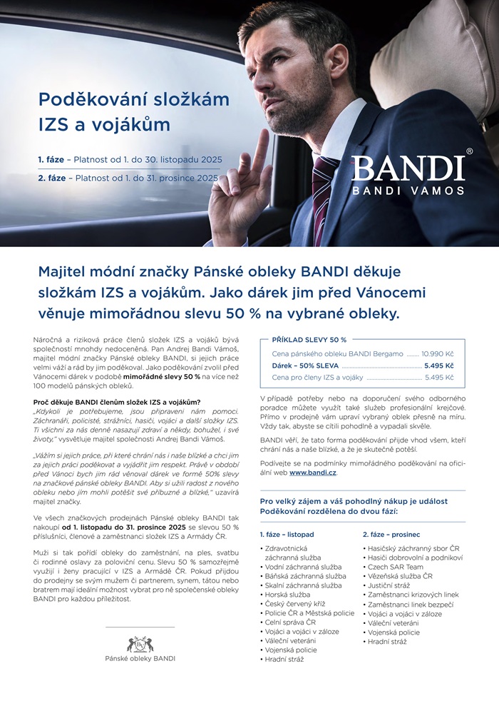 Pozor! Pokud chcete ve značkové prodejně BANDI koupit například společenský oblek pro syna nebo košili pro bratra, je nutné, abyste prodejnu navštívili spolu s ním a předložili váš vojenský průkaz nebo průkaz válečného veterána. Pokud daná osoba přijde bez vás a sdělí, že má v rodině vojáka, válečného veterána, nebo zaměstnance Ministerstva obrany, nebude možné slevu uplatnit.